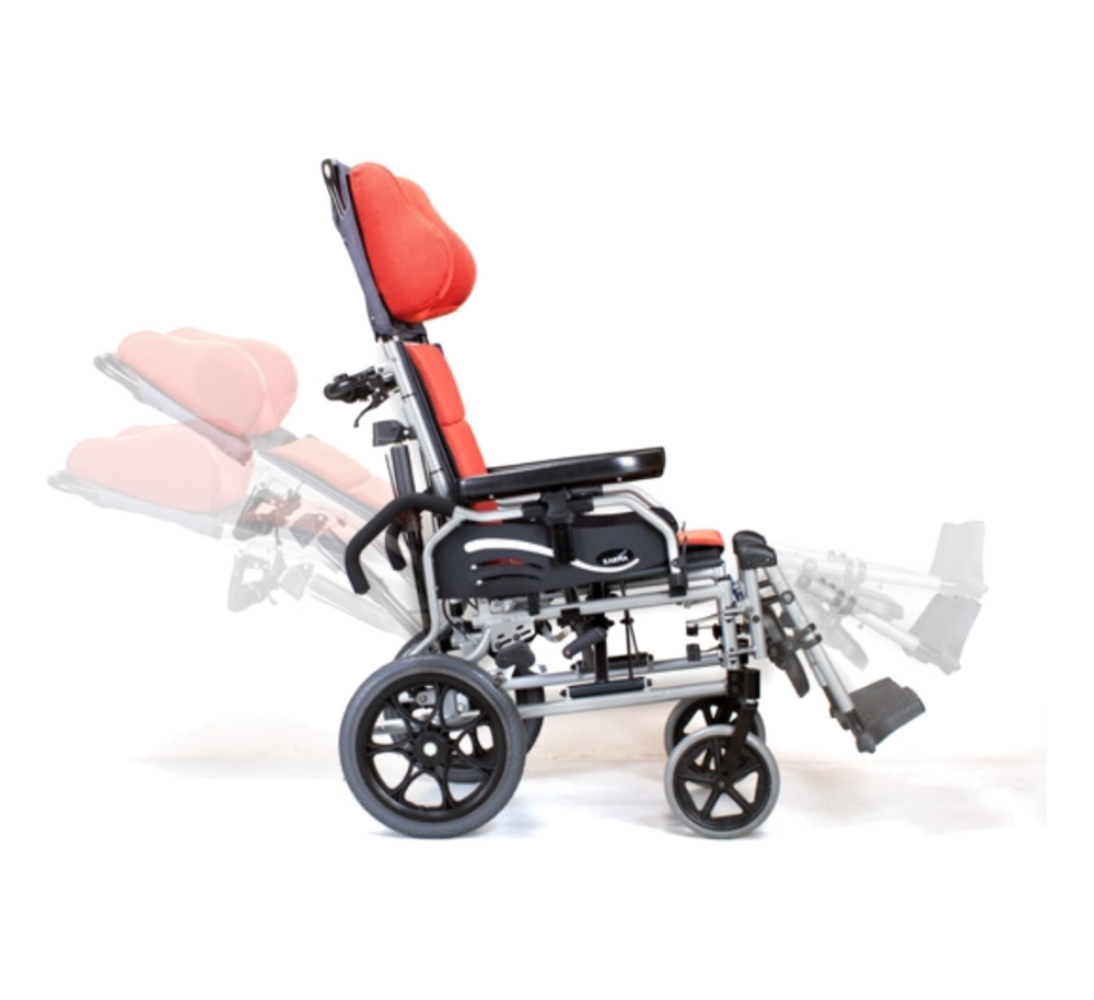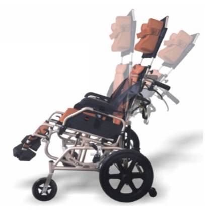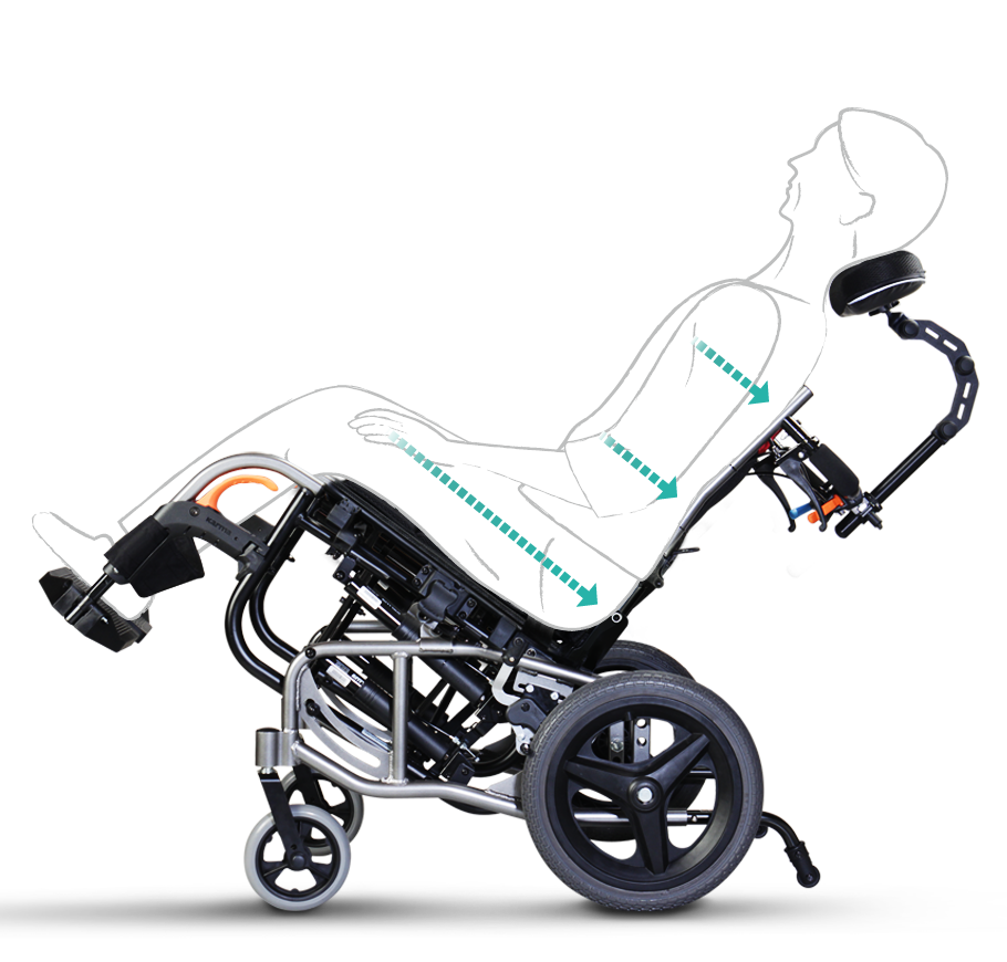 患者可以在輪椅上躺下來休息。適合上半身較無力,但是自己坐著還是可以稍微坐得穩,頭也不至於會沒力到會晃來晃去的患者。