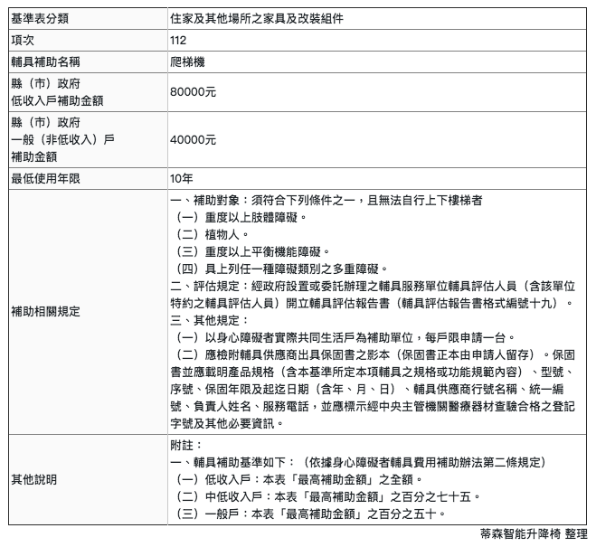 智能升降椅歸類於輔具的住家及其他場所隻家具及改裝組項的分類,其輔具補助名稱為爬梯機。