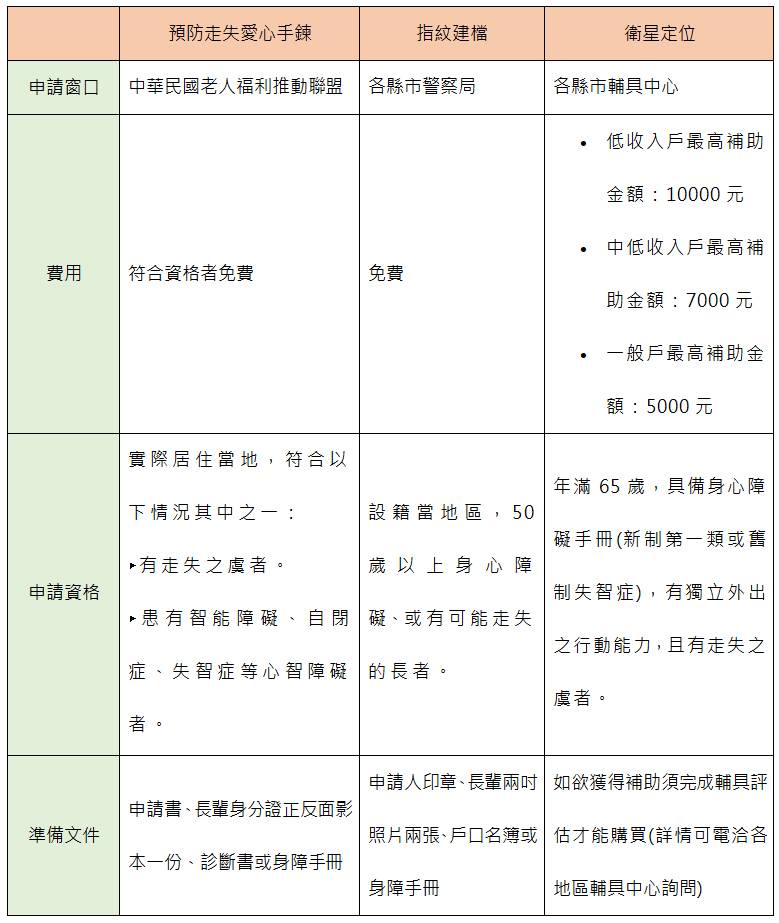 除了老人福利聯盟之外,各地區社會處也有推出「愛心不迷路手鍊」,上面有行動條碼(QR Code)與一組序號,掃描後就可以立即查詢到配戴手鍊的長者姓名與連絡資訊。