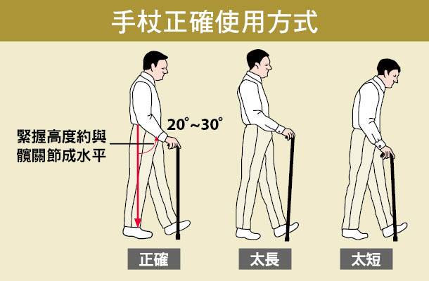 行動輔具中的步行輔具,能協助患者順利站立與行走,主要功能是加強患者站立或行走時的穩定度及支撐力。它能增加患者步行時的支撐面,幫患者減少、分攤下肢所承受的重量。至於如何挑選呢?除了一般直杖式手杖,為了提高穩定度,還發展出三腳、四腳型手杖,也有出門在外、攜帶方便的折疊式設計。在挑選上,要同時考量使用者的身高與手杖的長度,一定要讓長者試握,感覺順手度。