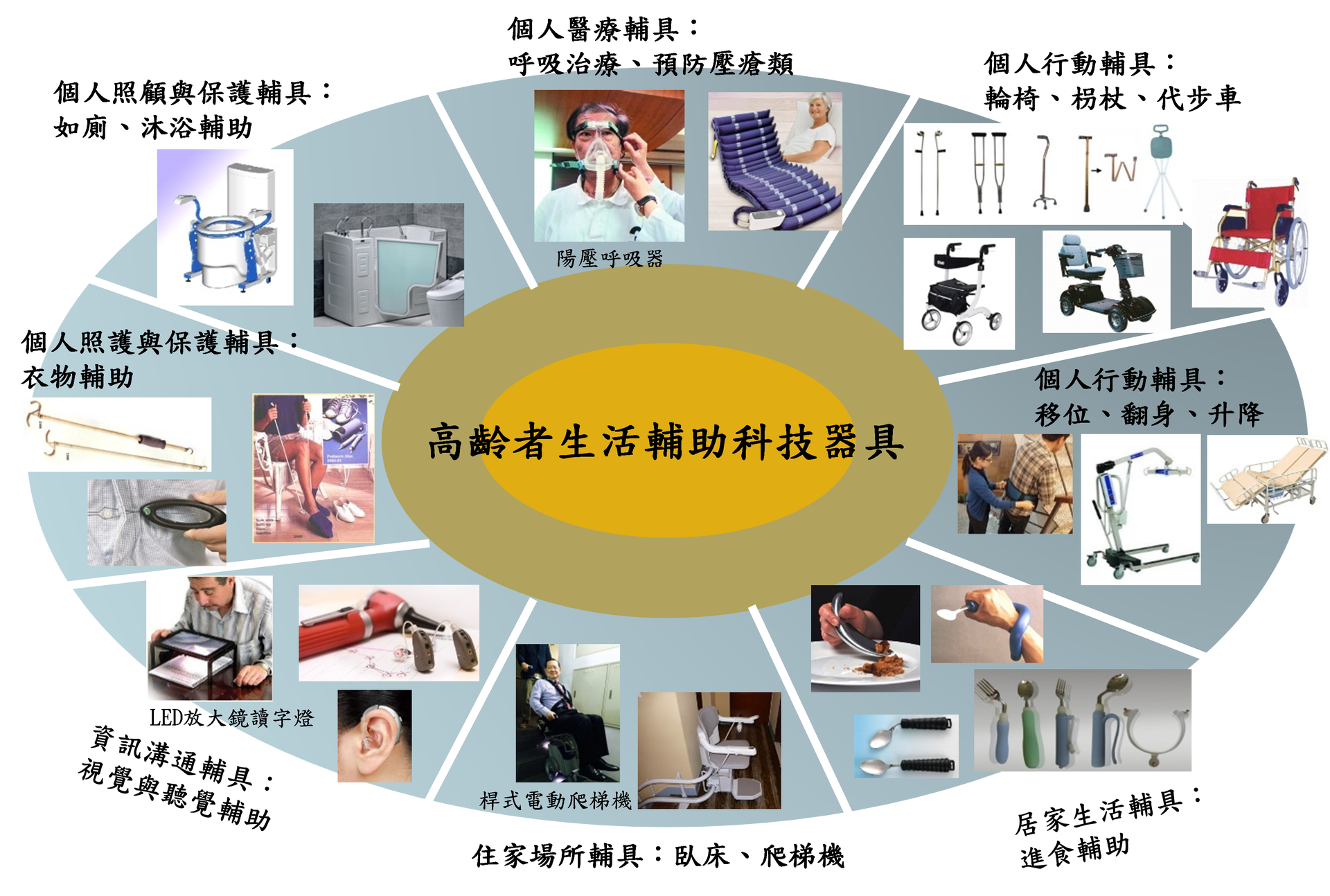 事實上,輔助工具的種類繁多,功用也有百百種,因此,在替長者或身心障礙人士挑選輔具時,應把握「安全、適用、美觀、省力、輕量化、合理價格」六大原則,且應根據使用者的個人身體狀況、不同的居家生活環境,選擇符合需求的合適輔具。