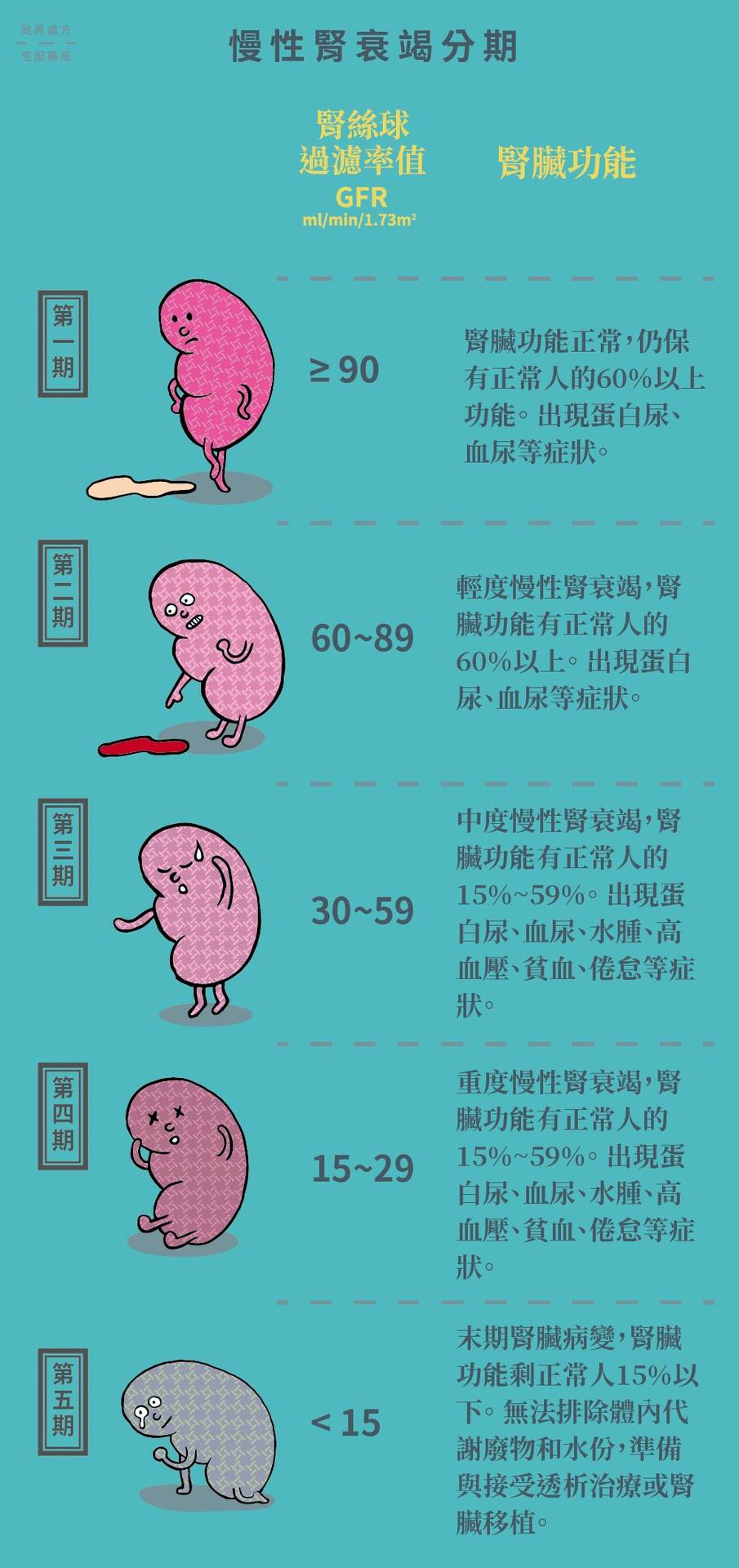 在這兩階段,患者的腎功能為正常人的15~59%,必需積極配合治療,延緩疾病惡化速率。
