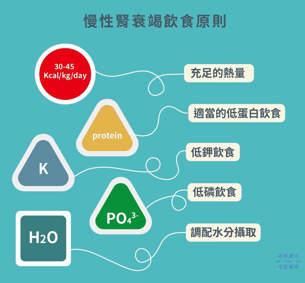 在醫護人員的指示下,患者應留意鈉攝取量,以免引發高血壓,進一步傷害腎臟。此外,患者的腎功能不如以往,無法執行正常代謝任務,因此也應限制鉀與磷的攝取量;若體內有有過多的鉀,肌肉與心臟會產生異常收縮現象,嚴重時恐危及生命;如果有過多的磷,就會造成副甲狀腺機能亢進、皮膚搔癢、骨骼病變等症狀。常見含鉀量高的食物如紫菜、菠菜、香蕉、奇異果、茶類等,而含磷量高的食物則有茶類、啤酒、咖啡、可樂及泡麵等,這些都是慢性腎衰竭患者須留意的食物種類。