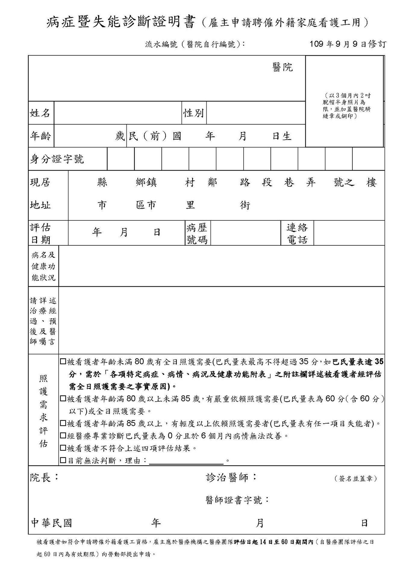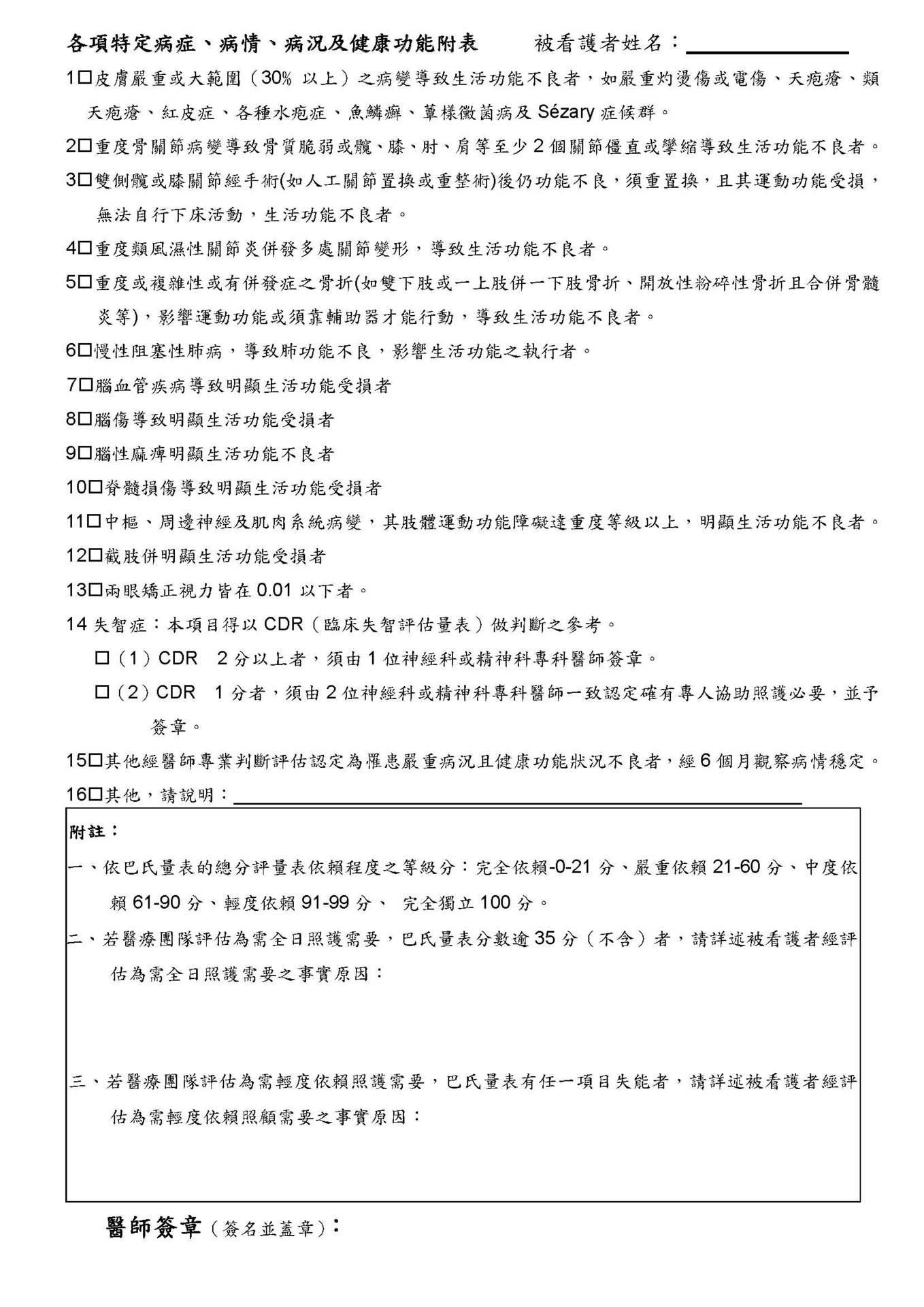 - 病症暨失能診斷證明書:由醫療人員開立的治療經過、預後及醫師囑言,以及受看護者的照護需求評估。