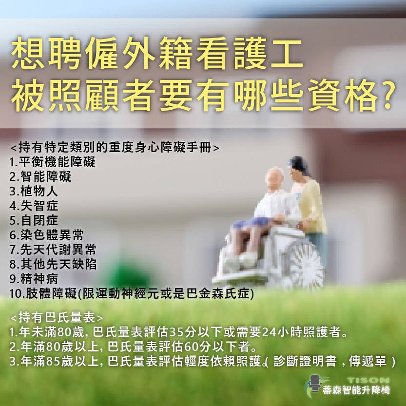 符合長期照顧服務申請及給付辦法第七條及第九條,且由各級政府補助使用居家照顧服務、日間照顧服務或家庭托顧服務連續達6個月以上 。雇主須先向各地照管中心申請,由照管中心給予認定是否符合資格,再向勞動部申請移工。