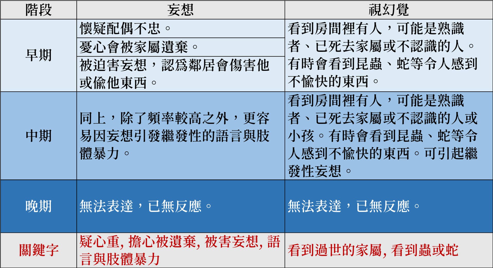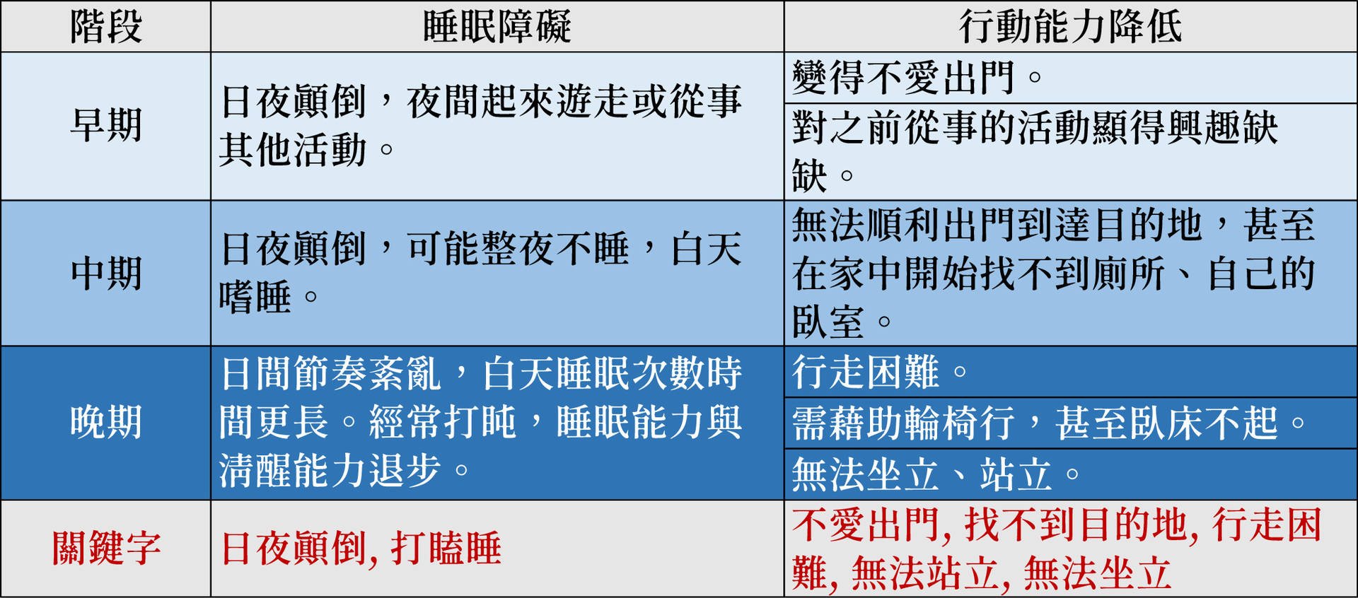 從以下我們整理出來各個階段的症狀關鍵字,讓我們家中的長輩與家人能有所警惕與觀察。