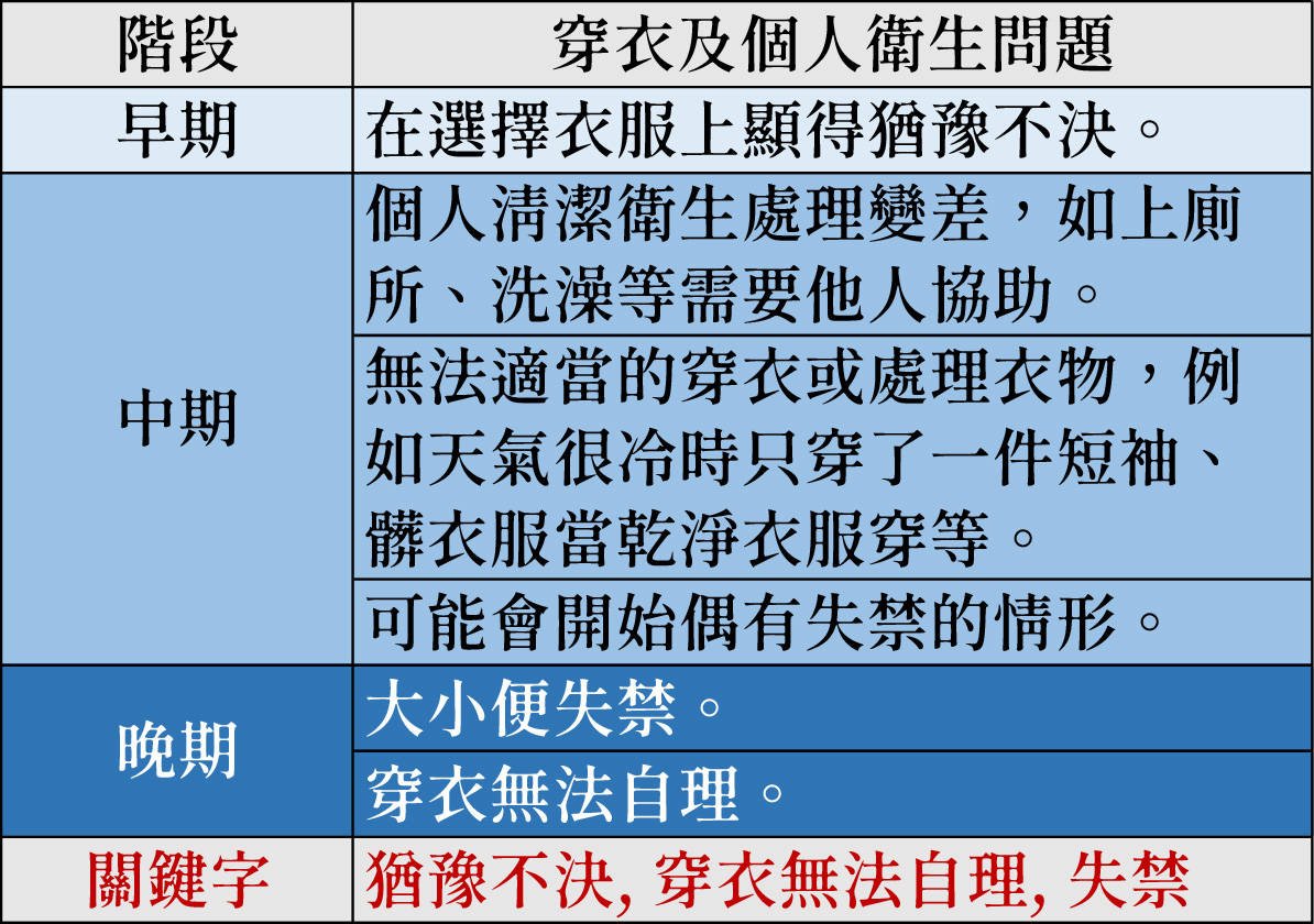 「穿衣及個人衛生問題」關鍵字:猶豫不決, 穿衣無法自理, 失禁。